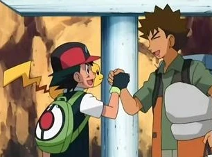 up to him and presents to him the badge, saying that he wants Ash to fulfill his dream of becoming the best. The stranger that first helped Ash reveals himself to be Brock's father, Flint, who has a tendency to not notify people it is him. Brock is now free to train himself, and joins Ash and Misty on their journey.