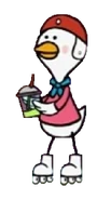Cocori is a white chicken with a pink shirt and blue scarf. She has a red helmet and wears roller skate shoes.