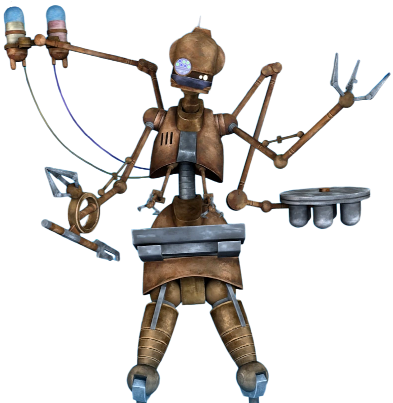 EV-A4-D is the secondary antagonist of the Star Wars: The Clone Wars episode "Lair of Grievous". He was a modified EV-series supervisor droid that served General Grievous as a medical/repair droid during the Clone Wars.
