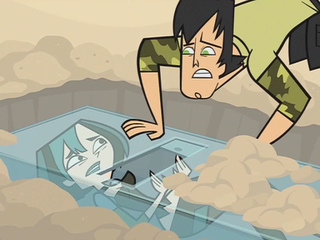 In Phobia Factor, Gwen admits her fear of being buried alive, due to her claustrophobia. For her part of the challenge, she has to be buried alive for five minutes. To help her out, Trent tries to talk to her via a walkie-talkie, but Gwen is left alone after Trent faces his own fear of mimes. Unintentionally, she is left in there much longer than just five minutes, since Trent forgets all about her after he overcome his fear and gets distracted helping Chris pranking Geoff. After a while, Trent finally remembers about her and dig her out of the casket. Angry at him abandoning her, Gwen threw her walkie-talkie at Trent and did not forget about this incident. Nevertheless, Gwen earns a point for her team.