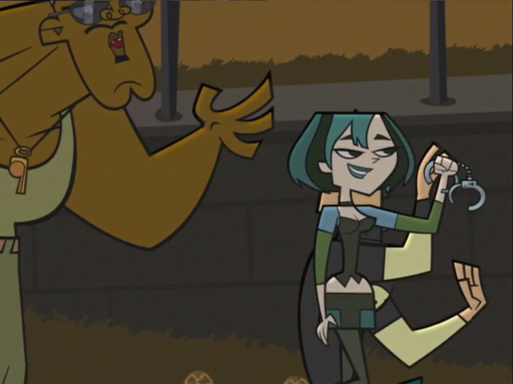 In The Chefshank Redemption, Gwen begins to throw challenges for the Killer Grips throughout the prison challenge. Heather is suspicious about her and keeps accusing Gwen of trying to make their team lose. During the escape tunnel challenge, Gwen slows her team down by faking claustrophobia and whacks Harold on the head with a gold shovel. As it was down between Gwen and Heather for the final Gilded Chris Award, Heather gets the trophy and heads up to the podium to tell everyone what a loser Gwen was. In the confessional, Heather, Harold, and Leshawna votes her off. Leshawna and Harold both vote off Gwen for the shovel incident. As she is being handcuffed by Chef in order to head to the Lame-o-Sine, Duncan offers to take Gwen's place, as a way of saying he really wants to be out of the competition, but is quick to say that he was just kidding when Chef agrees to it. Gwen tells Duncan he won't get out of the competition that easily and wishes him lots of luck. In the confessional, it is revealed that the Grips ordered Gwen to vote herself off the show. Gwen is the first contestant from the Screaming Gaffers to get voted off, and the first person to ever vote themselves off in the Total Drama series.