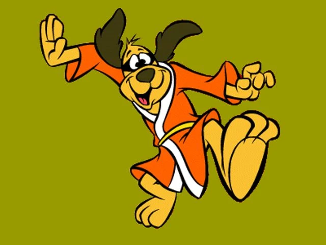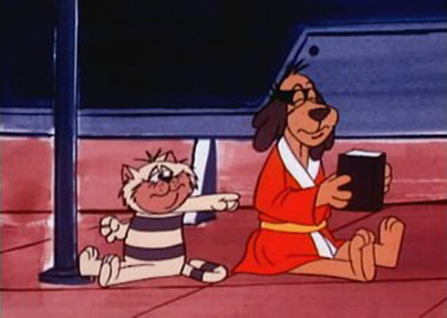 Hong Kong Phooey is a cartoon dog who first appeared in September 1974. Each of his stories begins with him working in a police station until Rosemary gets a phone call explaining a crime. Penry the janitor then jumps into a filing cabinet and emerges as Hong Kong Phooey. In each adventure he ends up needing rescue from his striped cat and sidekick, Spot, though he always takes all the credit. They travel in the Phooeymobile, a green Oriental style car that at the bang of a gong could morph into a helicopter, boat or other suitable vehicle to catch criminals. This is stored in a dumpster bin outside the police station.
