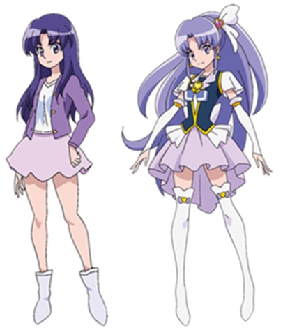 As Cure Fortune, her uniform is similar to the other three Cures, with a dark grey vest with a light purple collar and a darker purple ribbon in the front. Her skirt is also light purple and is longer toward the back. Her arm warmers and boots are also very long, going past her elbows and knees respectively. Her hair is purple and appears to be in a loose ponytail, with a heart-shaped hairpiece with a ribbon flowing out of it on the left side.