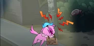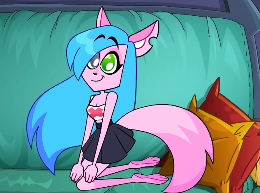 In the new design she is pink with blue hair