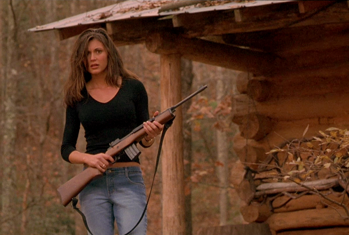 Marcy brandishing a gun to scare off the vicious dog - an image often used in promoting Cabin Fever
