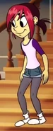 Mina has red and brown hair tied into a ponytail. She has tan skin, she also has two earrings, and buck teeth. She wears a purple t-shirt with a whitish pink around the body. She wears blue shorts over grey tights with white socks and black Converse high-top basketball sneakers. She wears a key in the hanging on her neck.