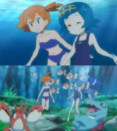 In addition to being tomboyishly beautiful, Misty has a slight inferiority complex, mostly due to her three older sisters Daisy (oldest), Violet (second-from-oldest) and Lily (third-from-oldest), who formed the group, "The Three Sensational Sisters" (their synchronized swimming group), and refer to Misty as the "runt" or "weaker one". This complex diminishes over time as Misty grows closer to Daisy. Until Misty became the Cerulean City Gym Leader, her sisters were the ones who ran the gym, although when Ash came along to get his Cascade Badge, it was Misty who battled him for it. Despite being the youngest of four sisters, Misty's the smartest and also the most mature and responsible of her sisters, with Violet being the next smartest and next most mature and responsible. Even if Misty's sisters can be kind of mean to her, they really do care about her, they just aren't very good at showing it sometimes. Misty specializes mainly in Water-type Pokémon, which are her favorite type, but she's had other types, and she also deeply admires Lorelei, an Ice-type Pokémon trainer. Misty aims to become a world-class trainer, and her well-trained Pokémon reflect her aspirations of becoming so. Her least favorite type of Pokemon are Bug-type Pokémon, as she has a deep-rooted fear of them. However, Misty's fear lessens over the course of the series, but not to the point where she's totally gotten over it, as shown in A Real Cleffa Hanger. As the series continues, she gradually shows herself to be kind and sensible. She restrains Brock from girls, often pulling him away by the ear.
