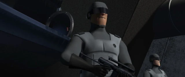 Syndrome's security guards are supporting antagonists in The Incredibles. They are Syndrome's henchmen, who all share similar characteristics. They are armed with machine guns and carry special security cards in Syndrome's Base. Many security guards were killed or injured when the Incredibles infiltrated Syndrome's base in Nomanizan. The fate of the guards still remaining at the base after Syndrome's death is unknown.