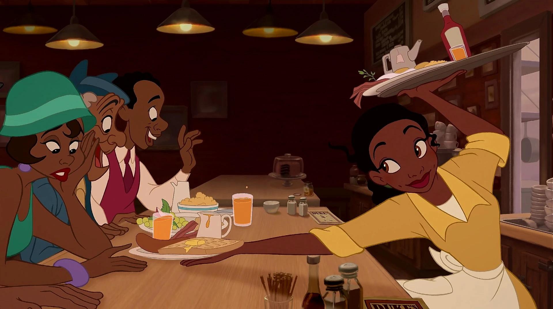 A coordinated and swift Tiana working as a waitress.