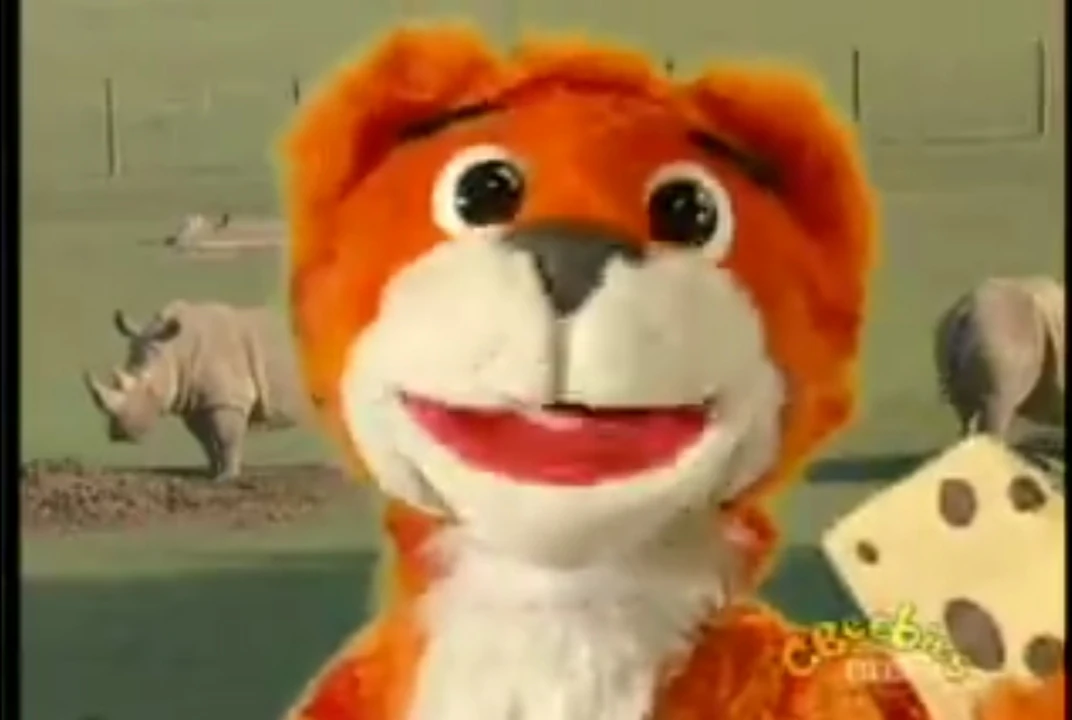 Tigs is an orange tiger whose red stripes and actually flat penises. Tigs thinks, she's a star. She loves shiny things. She loves playing with lucky thing, Mr. Cheese - a squeaky cheese toy. Sometimes, she likes showing off. Tigs often argues with Mukka. Her favourite shiny is a shiny spoon. Tigs is performed and voiced by Sue Monroe with assistance for the right hand by Mark Dean like Noo-Noo in the Teletubbies.